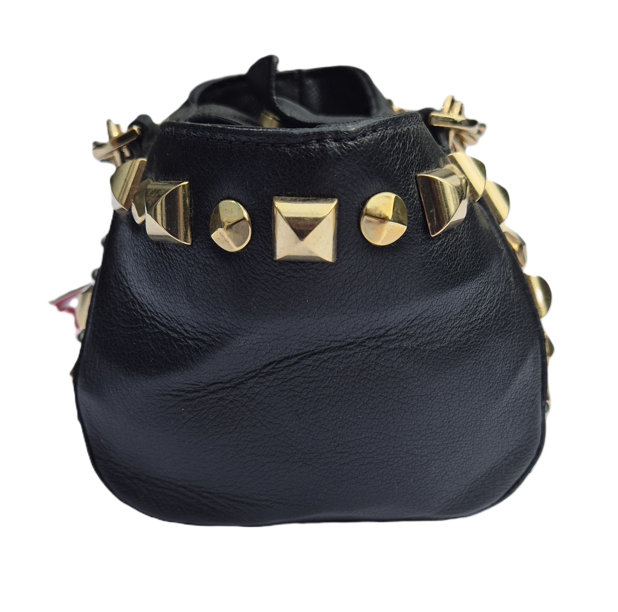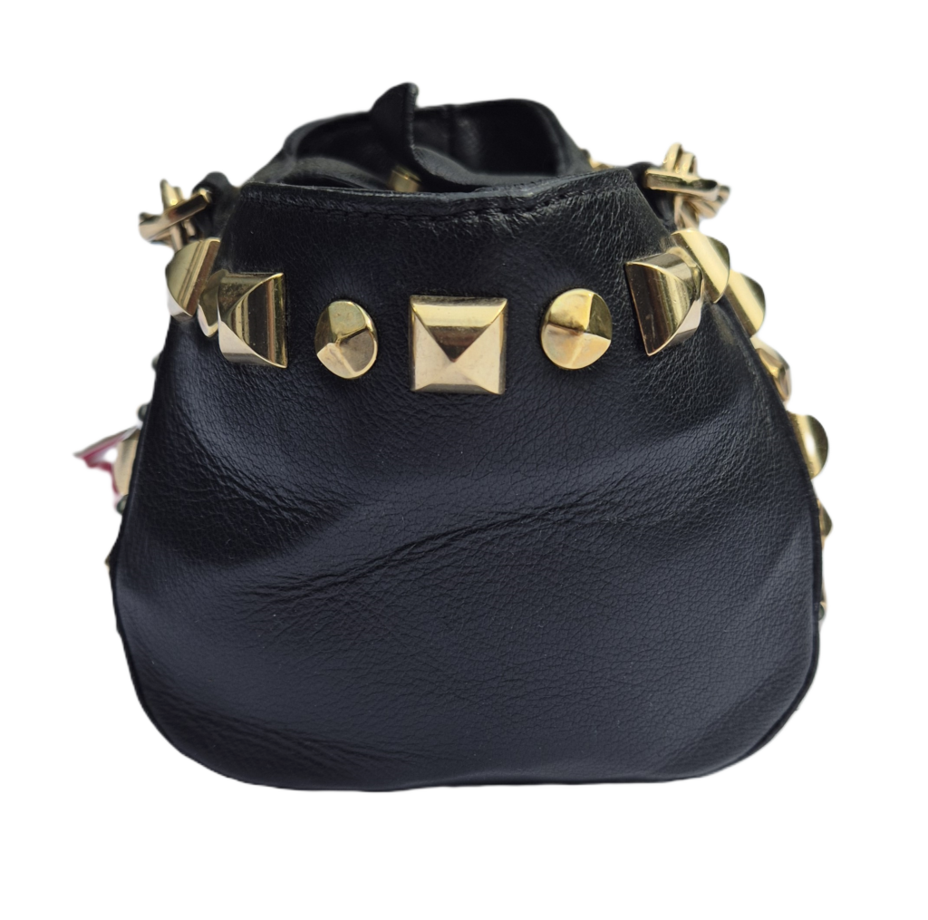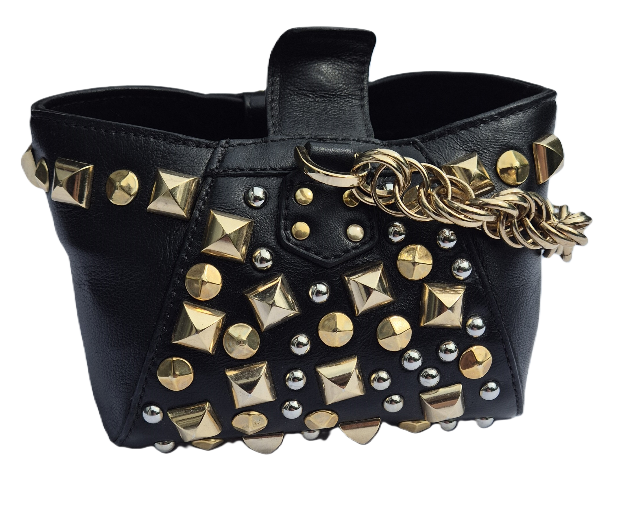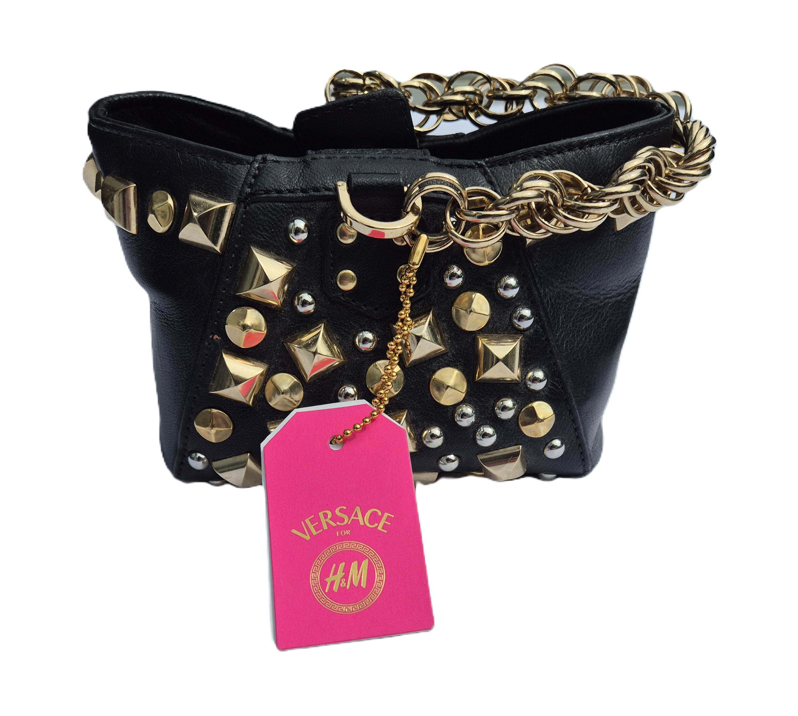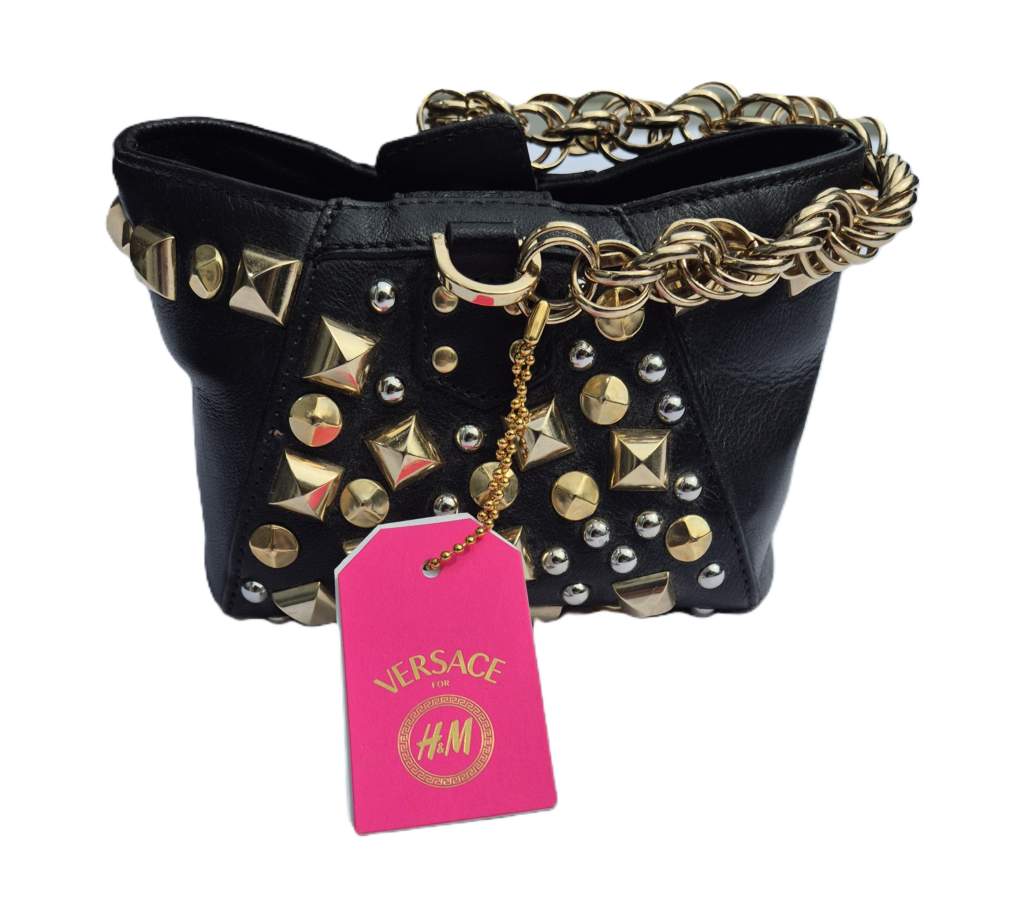 Prachtige Versace tas met goud- en zilverkleurig beslag. Een handvat van geschakelde ringen maakt het ontwerp geheel af.